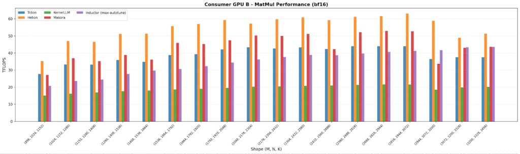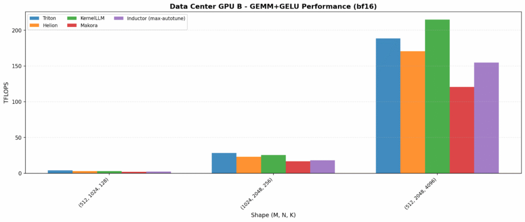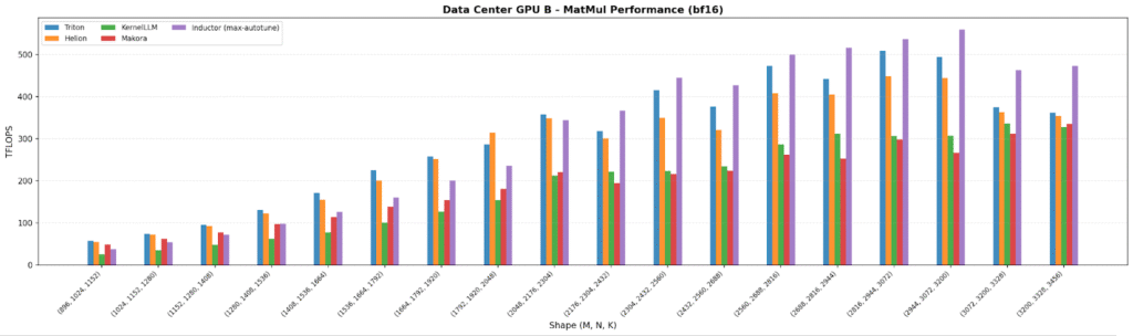 Kernel fusion – combining multiple operations into a single kernel to reduce memory traffic – increases both opportunity and variability. On one data center GPU, Inductor and Helion lead (~375–380 TFLOPS). On the other hand, KernelLLM is best (215 TFLOPS), showing LLM-generated kernels can land on excellent fused implementations.