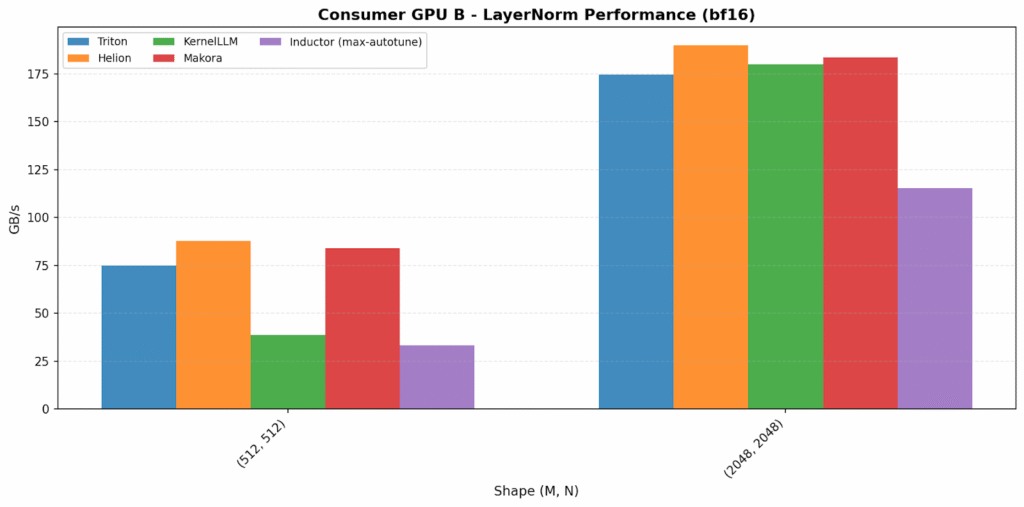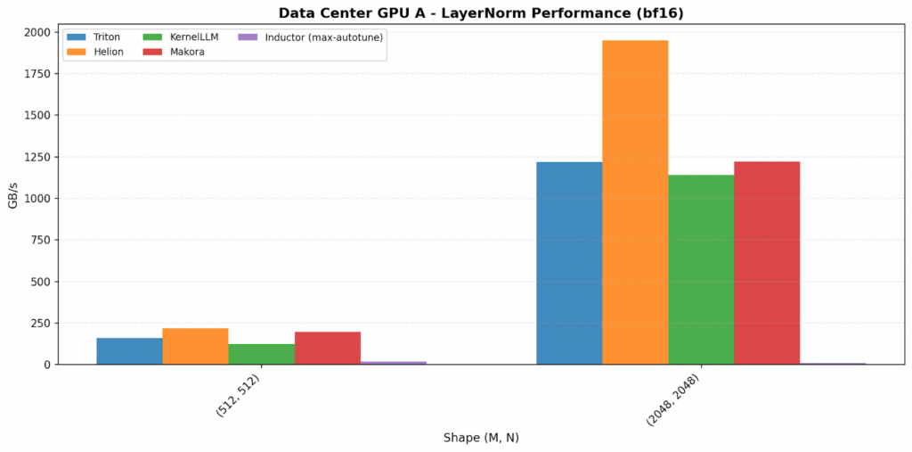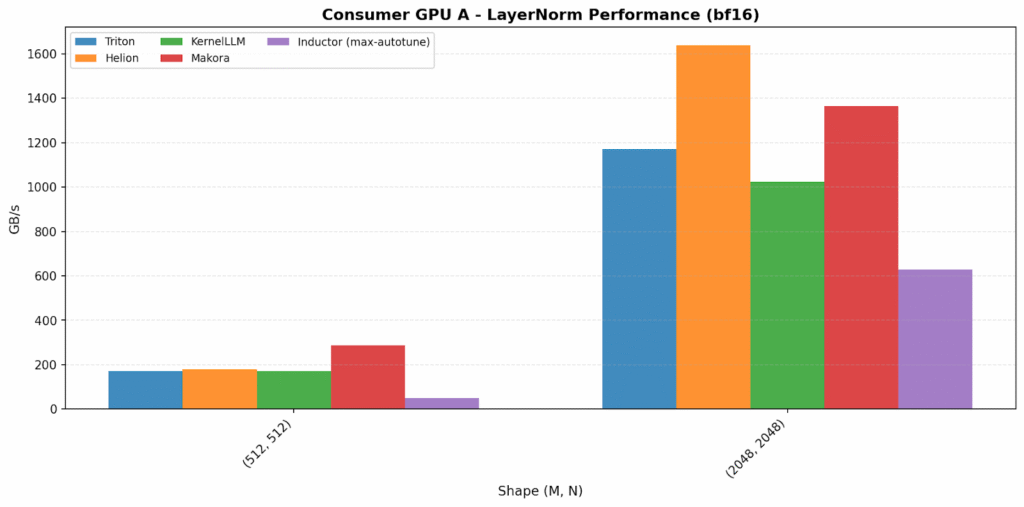 Before diving into results, it helps to frame what we’re actually comparing. In this benchmark we evaluate a spectrum of kernel-development approaches. We began with hand-written Triton kernels, which typically demand the most engineering effort but offer the highest performance ceiling. We then moved to compiler-driven approaches, comparing the more automated TorchIndutor backend with Helion, a high-level tile-first DSL for kernel authoring. Finally, we explored generative workflows using LLM-hosted tools KernelLLM and Makora Generate. Each backend represents a different trade-off between engineering effort, tuning cost, peak performance, and portability across GPU vendors.