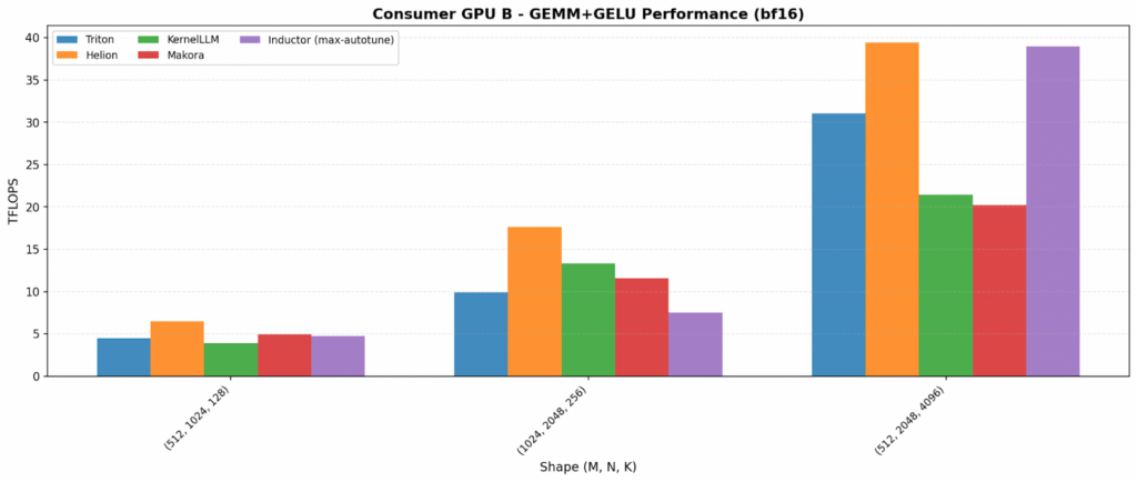 The only backend we encountered issues with was Helion for very small shapes on GEMM+GELU on the Consumer and data-center GPU B [10]. At production-relevant sizes, all backends reached 100% correctness.